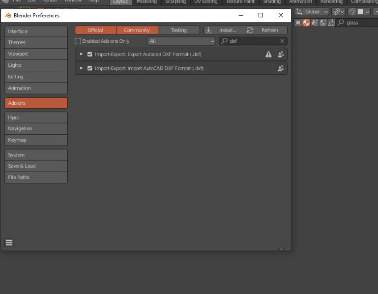 要能够导入或导出 .dxf 格式,你需要在 Blender 的偏好设置中启用 DXF 导入导出插件。