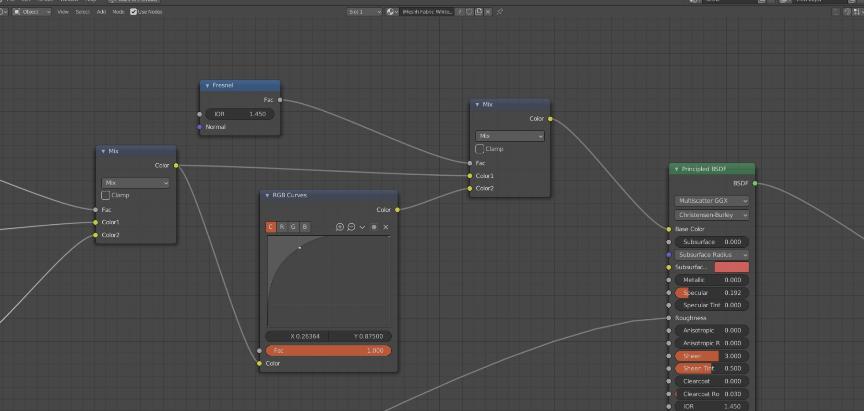 它基本上是将主纹理输出与RGB曲线混合,并添加菲涅尔输入作为混合因子。我通常将光泽设置在2以上,以根据着色器提升衰减(这不是规则,只是我个人喜好)。