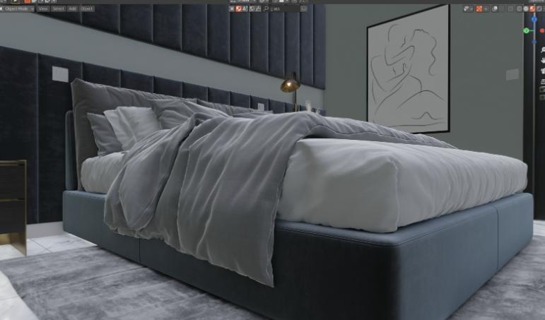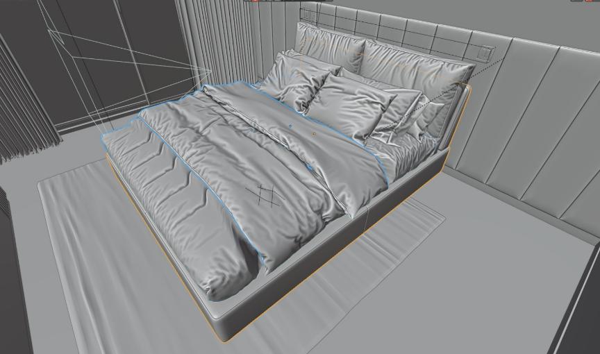 额外提示: 我们必须把每个场景都当作电影舞台来处理,在那里我们可以添加道具、所有必要的特效和装置,以实现最终的伟大效果。这方面没有限制,所以我为了增加亮点,在床角上方设置了一个随机点光——好像这边的聚光灯“在发挥作用”,尽管光源远离相机。