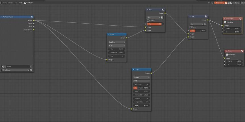 由于硬件限制,我通常不喜欢在合成器上用太多内容。这个场景我混合了雾光和条纹(都是眩光节点)。我更喜欢在外部照片编辑软件中调整色彩校正、饱和度、锐度和其他效果。