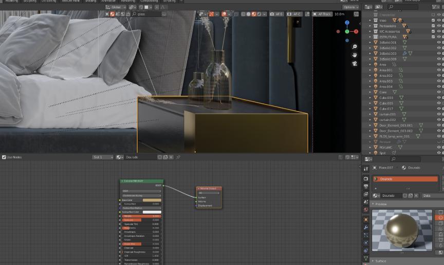 金色、木质、卡拉拉大理石、塑料和哑光金属等着色器都是通过贴图和Principled BSDF着色器实现的。时间紧迫,我不能专注于表面瑕疵和那些吸引目光、提升真实感的细节。